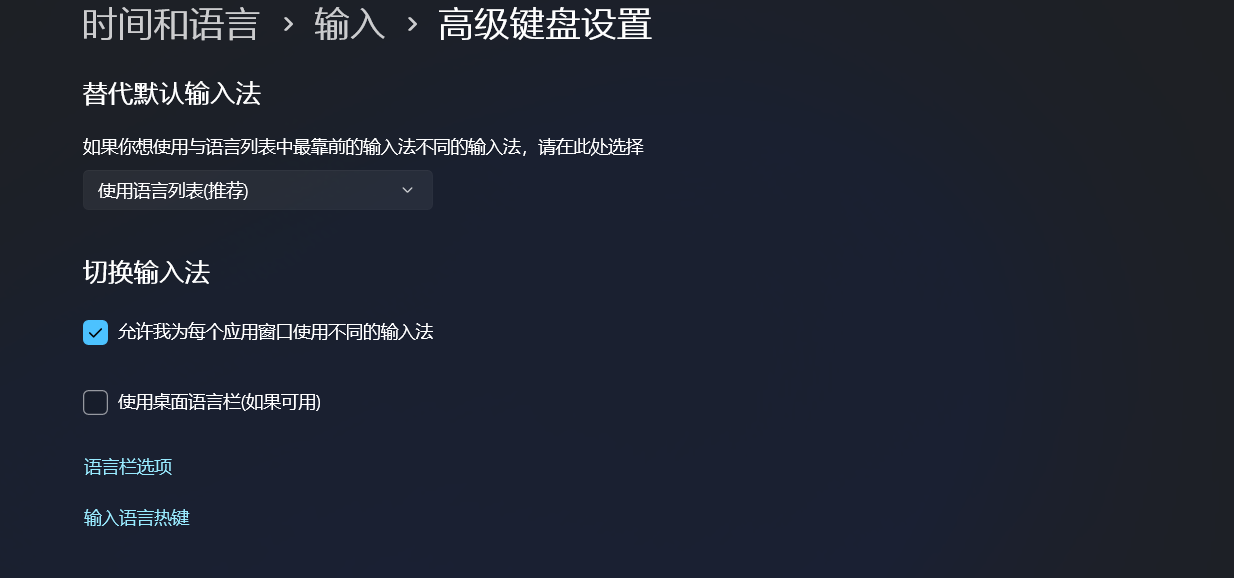 最关键步骤:在语言和区域中选择键入,然后点高级键盘设置,然后勾选,允许我为每个应用窗口使用不同的输入法。